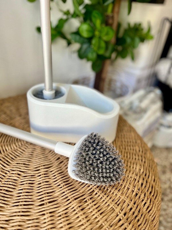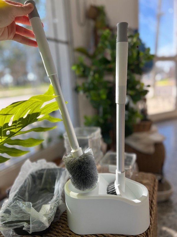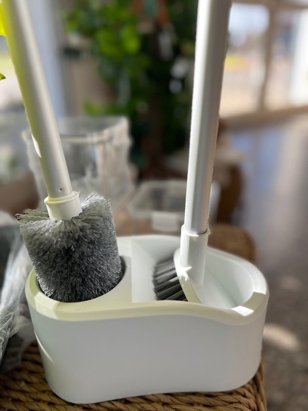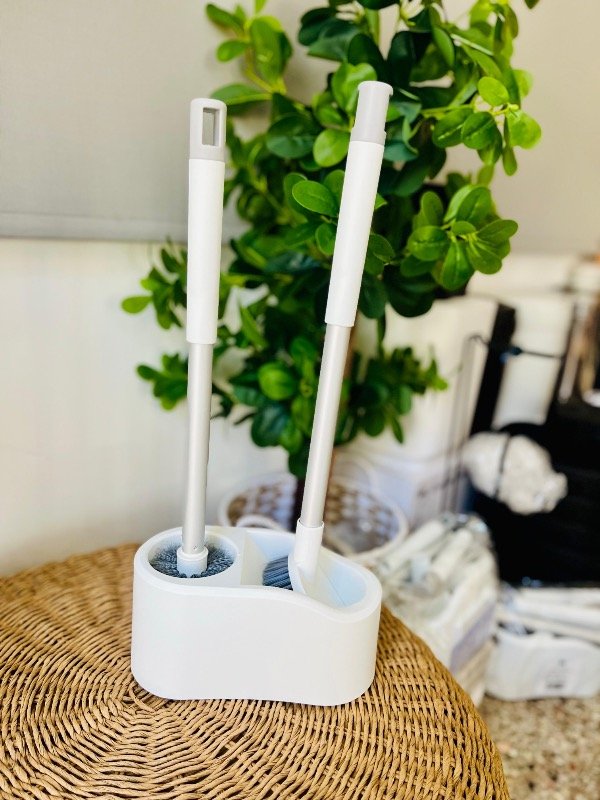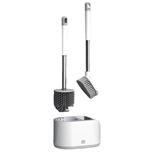 Set de dos cepillos para inodoro con base y adhesivo para pegar en la pared.