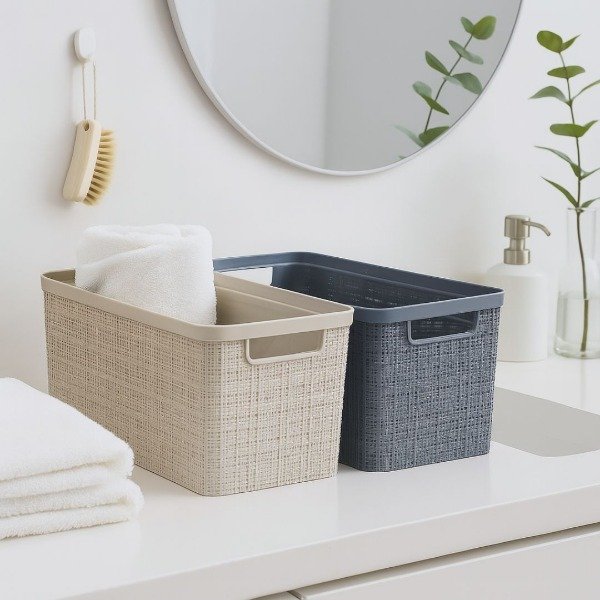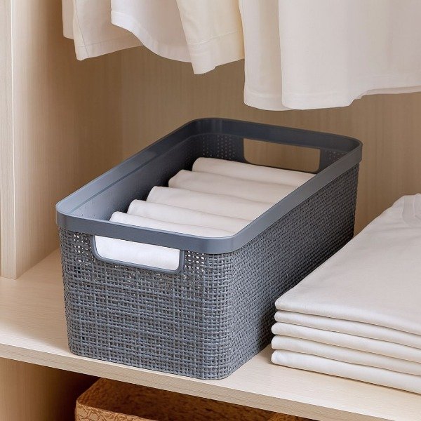 Canasto organizador rectangular de plástico rígido con textuta símil yute.