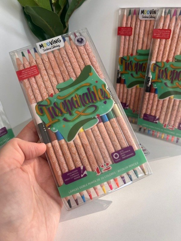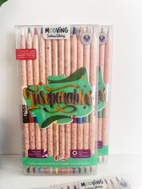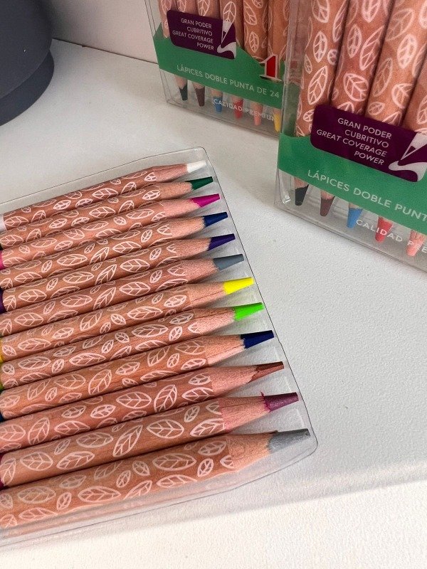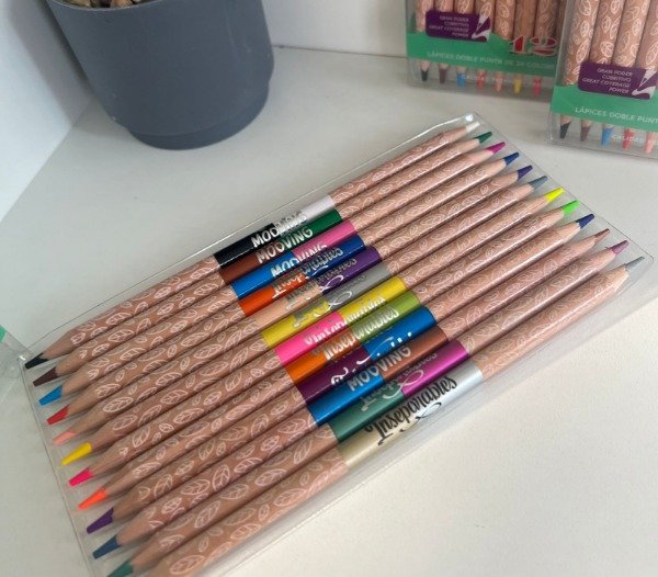 12 lapices de doble punta, 24 colores, 12 colores tradicionales, 6 colores neon y 6 colores metalizados.