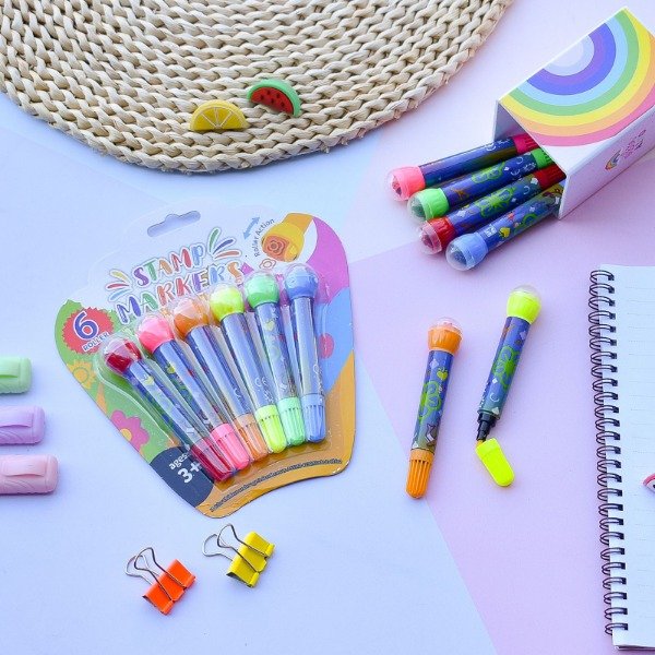 Set x6 marcadores de colores vibrantes con punta roller que estampa divertidas figuras mientras dibujas. Cada marcador tiene un diseño diferente.