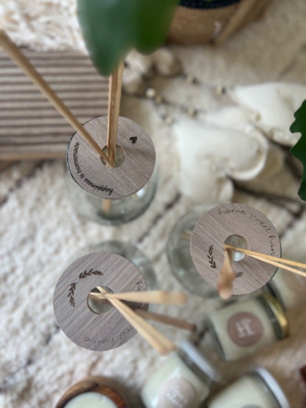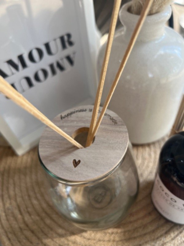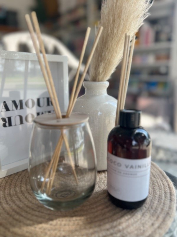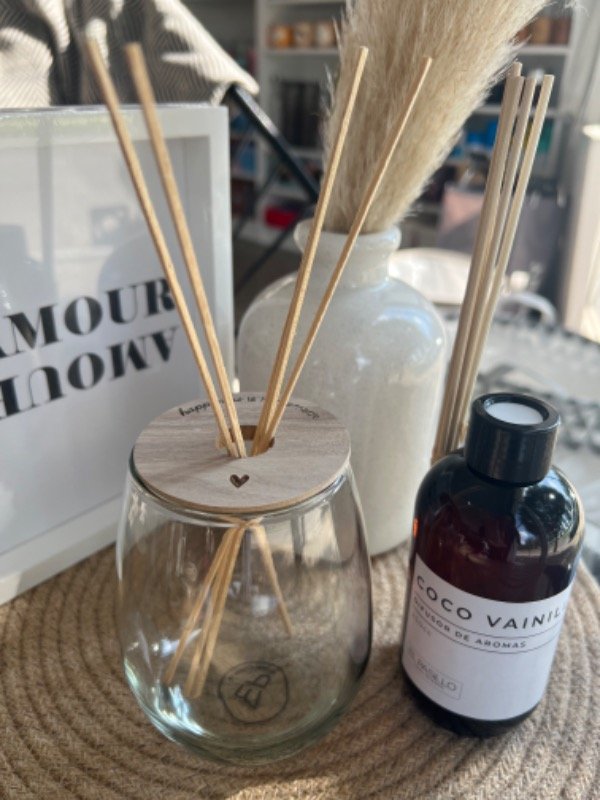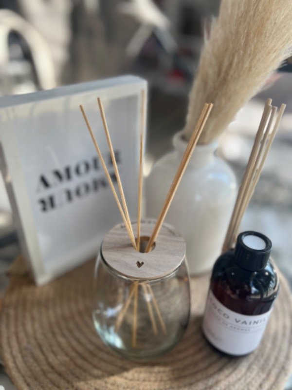 Envase difusor bombé de vidrio y tapa de madera con palillos